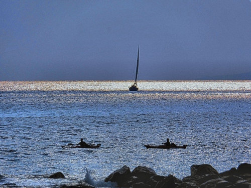 Altri tag (senza riscontro): vogatori, sera, paesaggio, blu, scoglio, cielo, controluce, riflesso, scogliera.