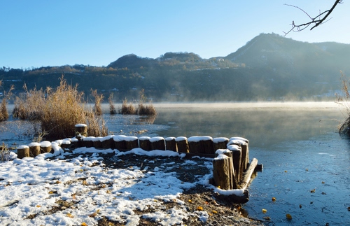 Tag: neve, lago, nebbia, acqua, inverno, montagne, cielo, pali, ghiaccio, legno, bianco, montagna, azzurro, piante, foschia.