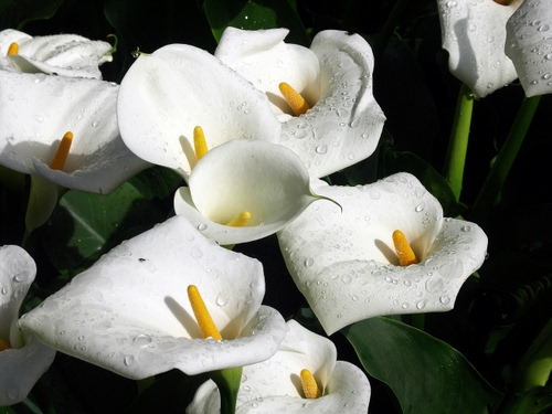 fioritura di un gruppo di candide calle con abbellimento di gocce d'acqua