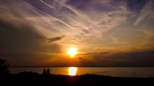 Tag: tramonto, sole, nuvole, cielo, persone, riflesso, acqua, mare, scie, controluce, alba, riflessi, silhouette.