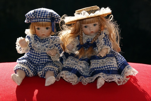 Tag: bambole, cappelli, due, blu, vestiti, rosso, giocattoli.