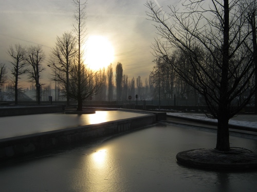 Nei dintorni di Milano, fontane ghiacciate e alberi in una mattina d'inverno.