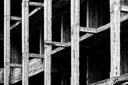 Tag: bianconero, cemento, costruzione, pilastri, travi, legno, linee, struttura, nero, geometrie, palazzo, rudere.