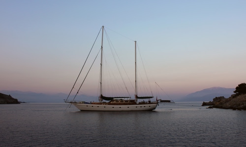 Tag: barca, mare, alberi, acqua, veliero, cielo, scogli, tramonto.