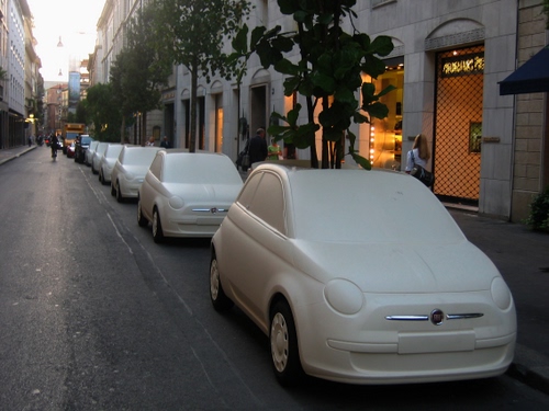 Milano, via Montenapoleone. Notare che le finte 500 sono dei... portavasi, con tanto di piante che sbucano dai tetti.