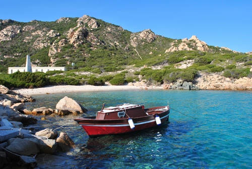 Tag: barca, acqua, mare, montagne, scogli, rosso, erba, rocce, verde, cielo.