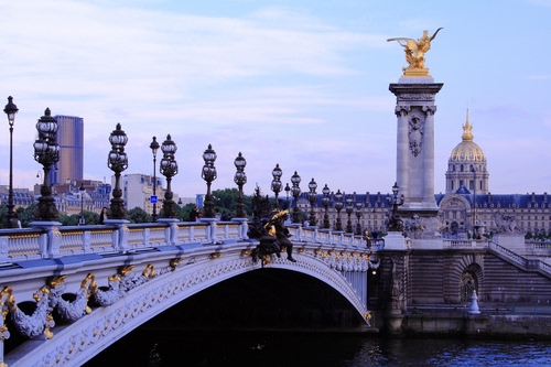 Ponte Alessandro III a Parigi. Sullo sfondo la cupola della tomba di Napoleone a destra e la Torre di Montparnasse a sinistra.
