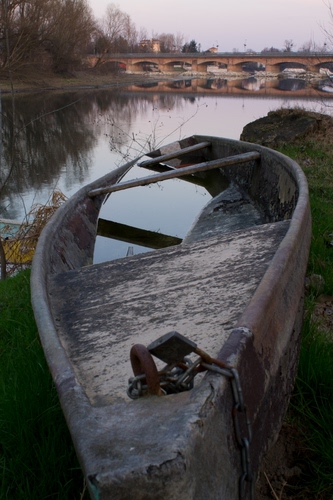 Tag: barca, ponte, fiume, lucchetto, acqua, archi, legno, catena, abbandono.