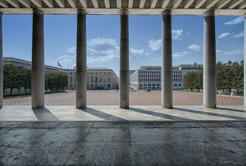 Tag: colonne, piazza, nuvole, prospettiva, edifici, cielo, ombra, marmo, palazzo, palazzi, alberi.