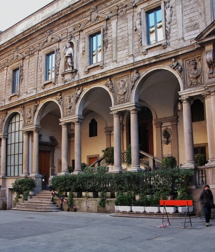 Archi e colonne del Palazzo delle Scuole Palatine in Piazza dei Mercanti a Milano.
