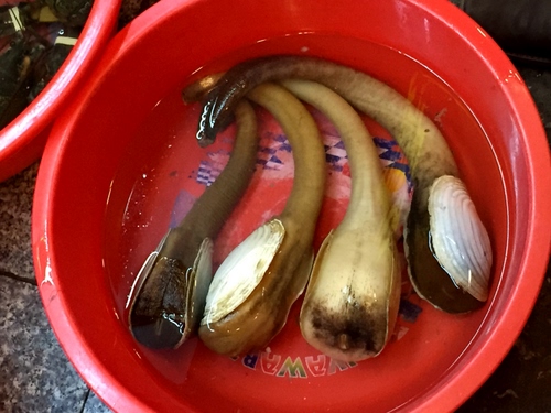 Non la so con precisione, credi si tratti del geoduck o vongola dalla proboscide (Panopea abrupta) In Oriente si crede che siano dei potenti afrodisiaci... |