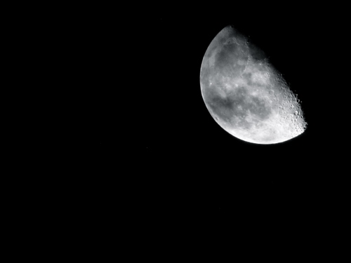 Una buona foto di uno dei miei soggetti preferiti. Una composizione piuttosto classica e rigorosa che segue pedissequamente la regola dei terzi, è sicuramente adatta al soggetto dello scatto. La scelta del bianconero è azzeccata, resa migliore grazie al buon contrasto e i neri profondi. Forse sarebbe opportuno dare un piccolo taglietto a destra, per ottenere gli angoli della luna equidistanti dal margine della fotografia o al contrario - lasciare un pizzico di respiro nella parte superiore dello scatto - ma è per davvero una piccolezza. |