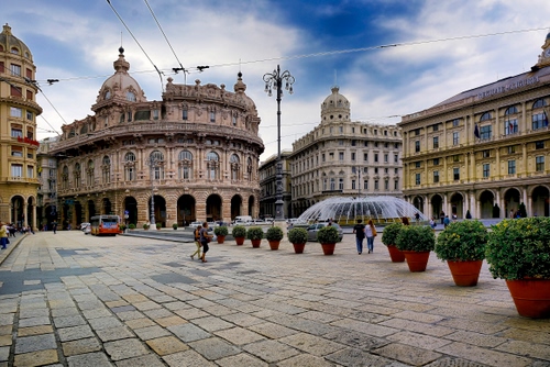 Tag: piazza, fontana, vasi, palazzi, genova, cielo, piante, passanti.