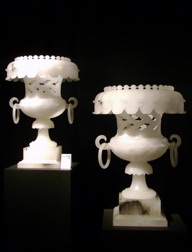 Coppia di vasi in alabastro esaltati da un bellissimo contrasto con il fondo nero.