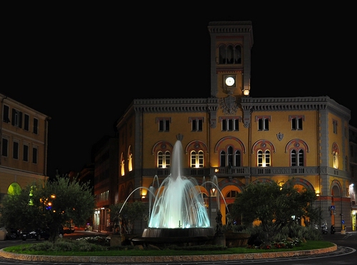 Tag: fontana, orologio, finestre, notte, palazzo, acqua, notturno, torre, piazza, luci, piante, verde, zampilli, archi, aiuola, palazzi, case.