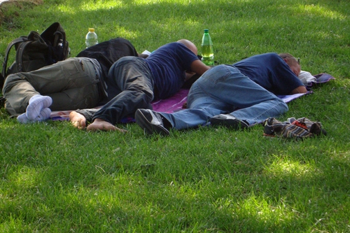 migranti che si riparano dal caldo di roma su un prato di villa celimontana