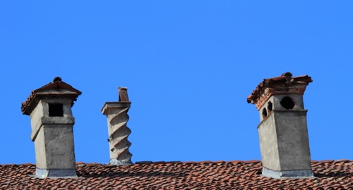 Tag: tetto, tre, comignoli, tegole, cielo, azzurro.