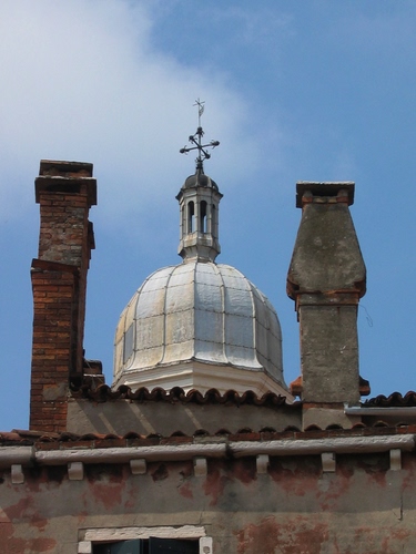 Due vecchi comignoli incorniciano la cupola di una delle tante chiese di Venezia.
