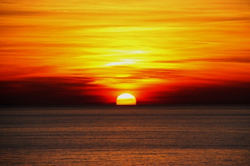 Il tramonto è forse il soggetto di paesaggio più fotografato. Ma non tutti i tramonti sono fotografati allo stesso modo! Nella foto descritta l'autore rappresenta un preciso canone estetico. il sole è al centro dell'inquadratura sull'asse orizzontale, mentre è a circa due quinti sull'asse verticale. La scelta stilistica è riuscita perché da un lato dà equilibrio e dall'altro asseconda l'accostamento dei colori che si sviluppano orizzontalmente, il giallo del cielo e l'azzurro acceso del mare con po stesso "peso" e la striscia centrale con il sole e l'arancione ed i rossi tendenti al granata fin quasi al nero. Il risultato appaga l'occhio e crea una immagine di quinta prospettica che valorizza lo spettacolo che si ripete ancora una volta.