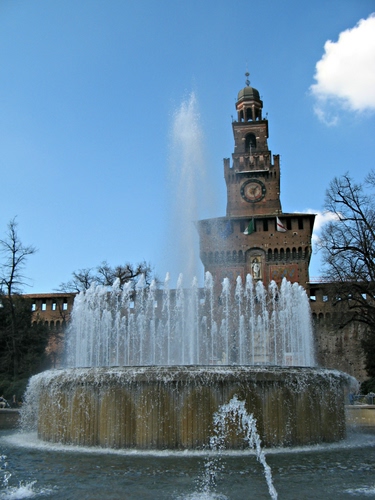 Tag: fontana, acqua, castello, torre, milano, cielo, zampilli, spruzzi.