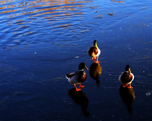 Tag: acqua, tre, anatre, uccelli, lago, riflessi, ghiaccio, papere, blu.
