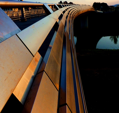 Tag: ponte, acqua, riflesso, fiume, prospettiva, curve, curva, oro, metallo, riflessi, tramonto.