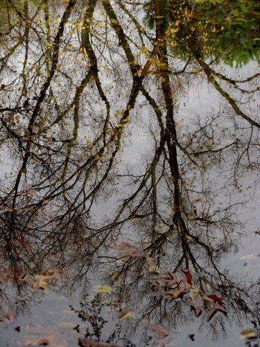 Un albero si riflette in una pozzanghera lasciata da un temporale autunnale