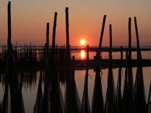 Tag: tramonto, sole, mare, pali, acqua, reti, rosso, riflesso.
