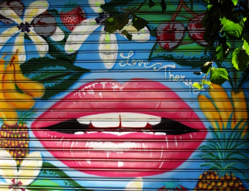 Parte di un dipinto su una saracinesca, a Milano.
