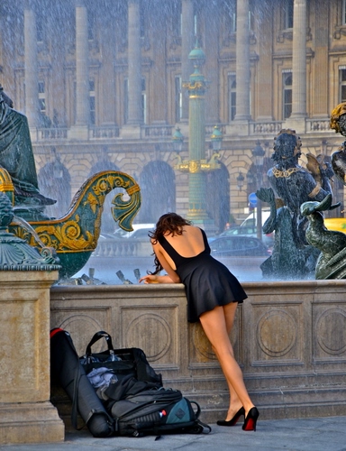 Per la verità mi trovavo in place de la Concorde a Parigi e stavo fotografando la fontana. Improvvisamente compaiono un fotografo con i relativi bagagli degli strumenti di lavoro e la modella ritratta in foto. Per molto tempo monopolizzano la fontana e mi impediscono qualsiasi inquadratura senza la loro presenza. Insomma dei veri e propri elementi di disturbo. Allora mi sono almeno concesso di "rubare" qualche scatto della modella come risarcimento per non aver potuto fotografare la fontana come avrei voluto. Ho dovuto quindi accontentarmi di quello che la mia posizione mi consentiva (bagagli compresi). ![]() |
