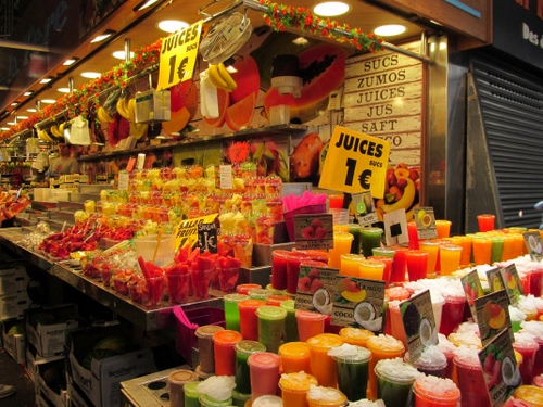 Sì a Barcellona, il mercato coperto della boqueria, un tripudio di frutta colorata e appunto succhi già pronti. |