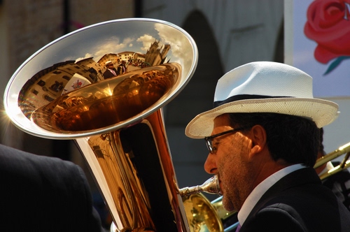 Altri tag (senza riscontro): fiore, nuvole, bassotuba, campana, banda, dorato, strumenti, concerto, suonare, bocchino, suonatore, viso, rosso, case.