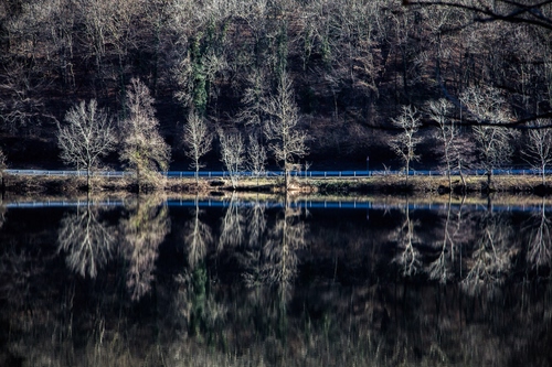 Belli gli alberi spogli che risaltano nello scuro del bosco e dell'acqua |