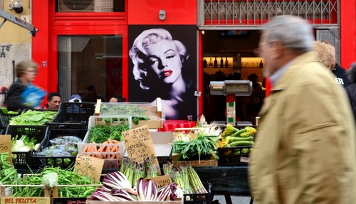 Scattata al mercato delle erbe (P.zza Cavallotti) di Livorno. Dietro questo banco spunta questa foto di Marylin, messa lì dal proprietario di quel bar alle spalle dell'esercizio. La sua bellezza ammiccante disarma nonostante le cipolle e gli asparagi di "Pisa". Chissà a che pensano i passanti?