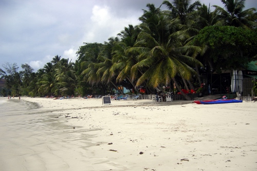 una spiaggia delle Seychelles con la sabbia quasi bianca