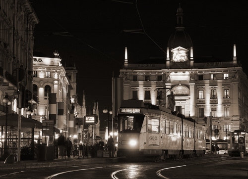 Tag: tram, notte, bianconero, luci, palazzi, rotaie, notturno, binari, strada.