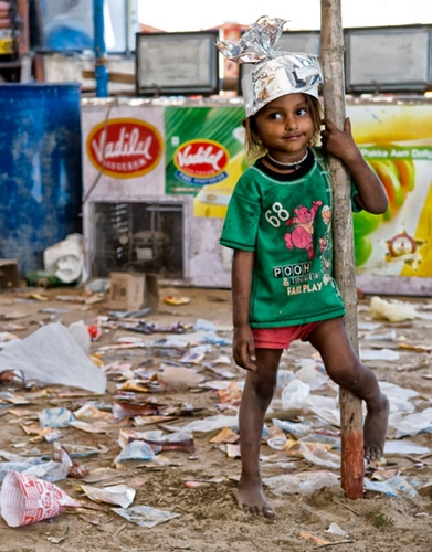 Composizione ben costruita, il soggetto defilato a destra e il gioco prospettico della visuale proprio da destra a sinistra. Linee cadenti direi ben curate e anche i colori sono vivaci nonostante la zona d'ombra. Ottimo anche il momento di scatto con l'espressione della bambina molto da biricchina. Infine interessante contrasto tra il pavimento pieno di rifiuti e il banco dietro con dei monitor. Danno un po fastidio nel contesto generale le scritte rosse pubblicitarie in alto a sinistra che tendono a rompere l'equilibrio cromatico.