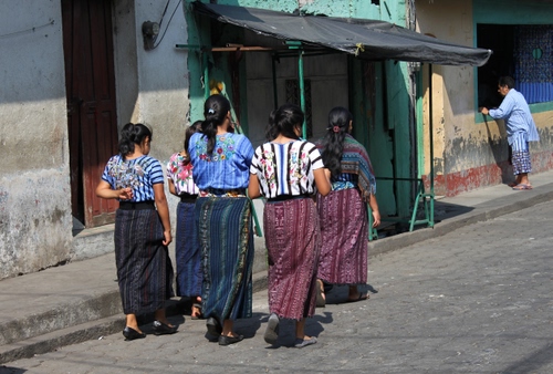 Cinque donne in una via di Santiago Atitlan, in Guatemala.