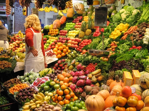 Tag: frutta, verdura, donna, banco, mercato, fruttivendola, cibo, colori, banane, negozio.
