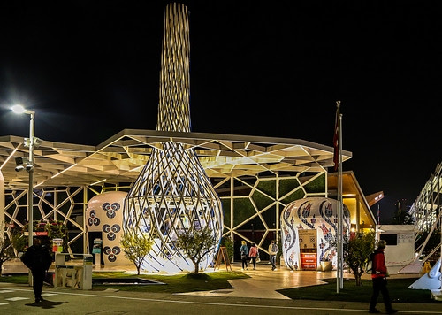 Tag: expo, padiglione, luci, notturno, notte, persone, sera, piante, passanti.