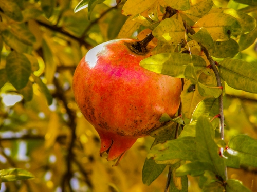 Il melograno è molto fotogenico e qui è bello in contrasto con giallo e verde delle foglie. |