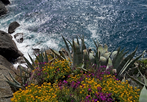 Tag: mare, fiori, onde, scogli, acqua, giallo, agave, piante, scogliera, viola, rocce, schiuma.