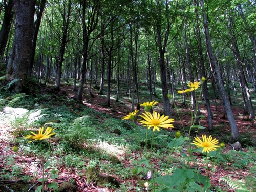 Tag: alberi, bosco, fiori, giallo, verde, erba, margherite, tronchi.