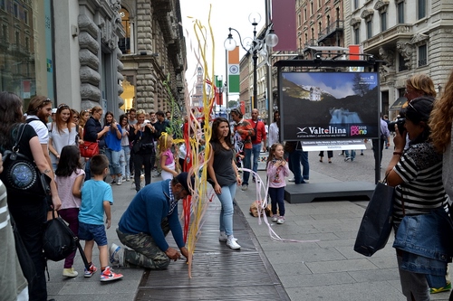 Passeggiando per una via di Milano, questo signore lega nastri colorati alle grate dove esce aria ed i bambini apprezzano molto!