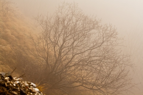 In una giornata di inverno, una pianta, nella nebbia, lungo la pendice di un monte, riafferma la volontà di vita della natura.