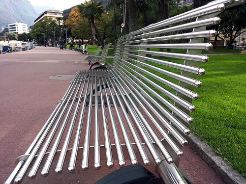 Tag: panchina, panchine, strada, acciaio, prato, verde, alberi, metallo, prospettiva, argento.