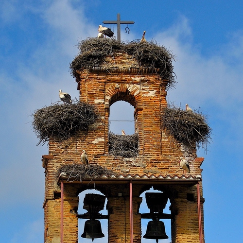 Infatti non è facile vedere tante cicogne nidificare in una "casa" così angusta . Qui siamo in un paesino della Spagna (di cui non ricordo il nome), lungo il cammino di Santiago de Compostela . Un saluto. |