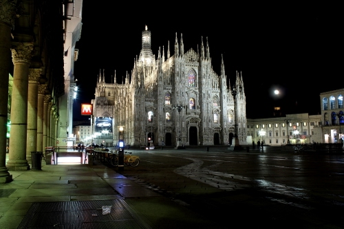 Tag: milano, duomo, colonne, piazza, notte, luci, notturno, chiesa, finestre, biciclette, portico, guglie, gotico, riflessi, metropolitana.