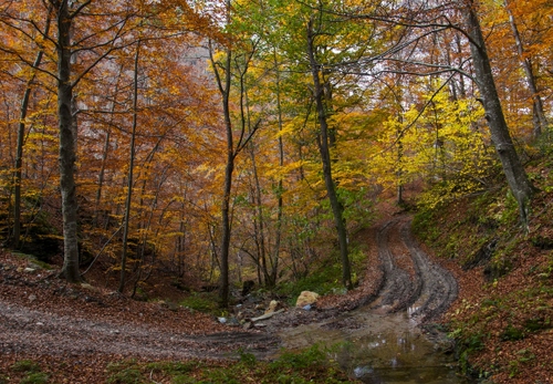 Tag: bosco, alberi, sentiero, autunno, strada, foglie, giallo, curva, verde.