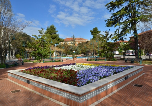 Tag: fiori, aiuola, alberi, cielo, panchine, giardino, piazza.